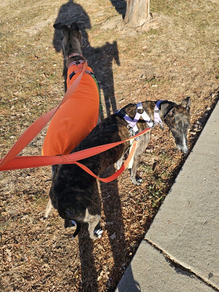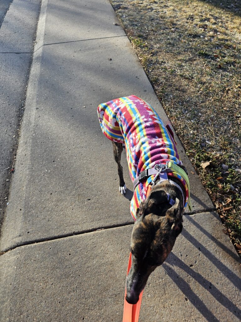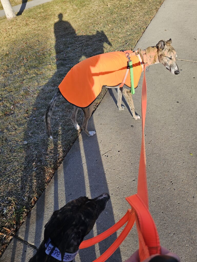 Res: We have had a busy day! It started getting cold in Colorado so Dad decided to put us in our coats. It was just under 30 degrees and he was muttering something about “this will be interesting.” Well, I like my coat so I had no problem putting it on! It matches my colors.