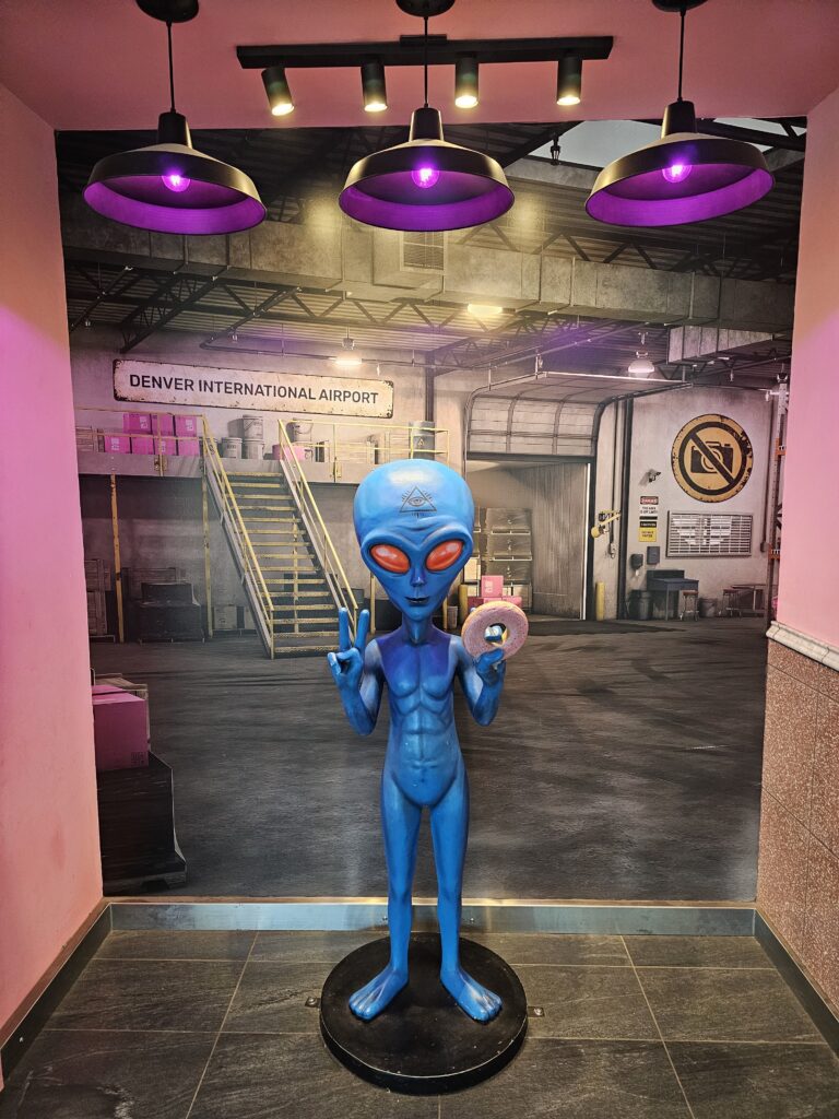 While walking around the B terminal I found the mysterious alien that everyone says is hanging around the airport. He was busy eating Voodoo Donuts today.