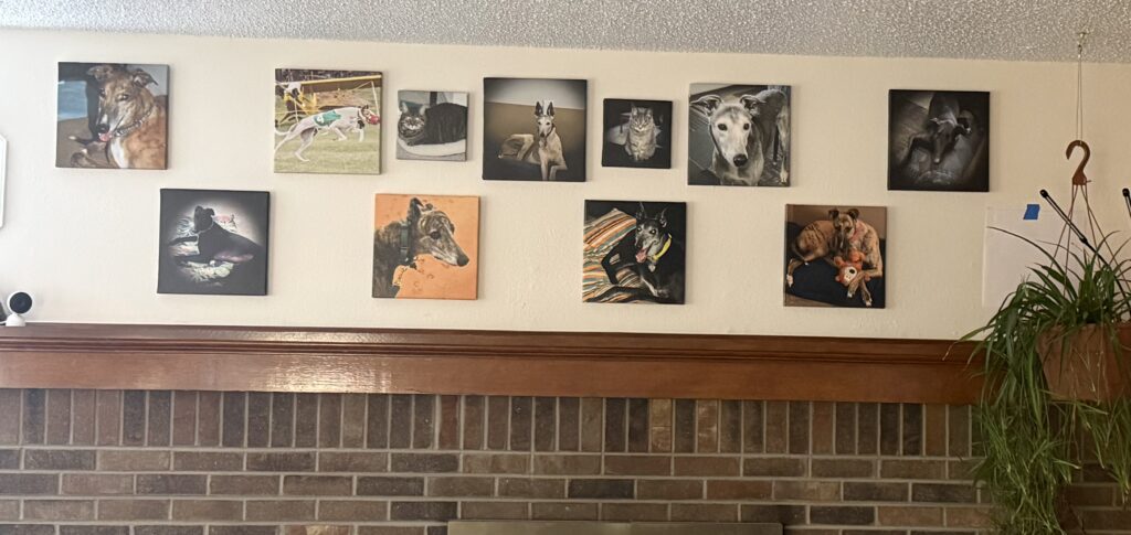 Jesse sent me some neat photos of what he did with the wall over the mantle in our family room. It was time to hang the pack photographs back up, and they look good. I am missing one photograph which we need to solve, we need one of Climber. But she is very difficult to take photographs of because she is so crazy in motion at times.