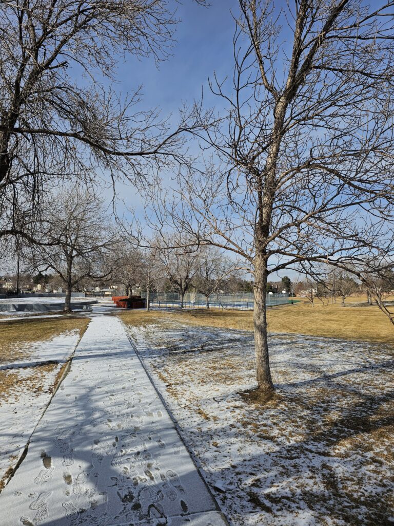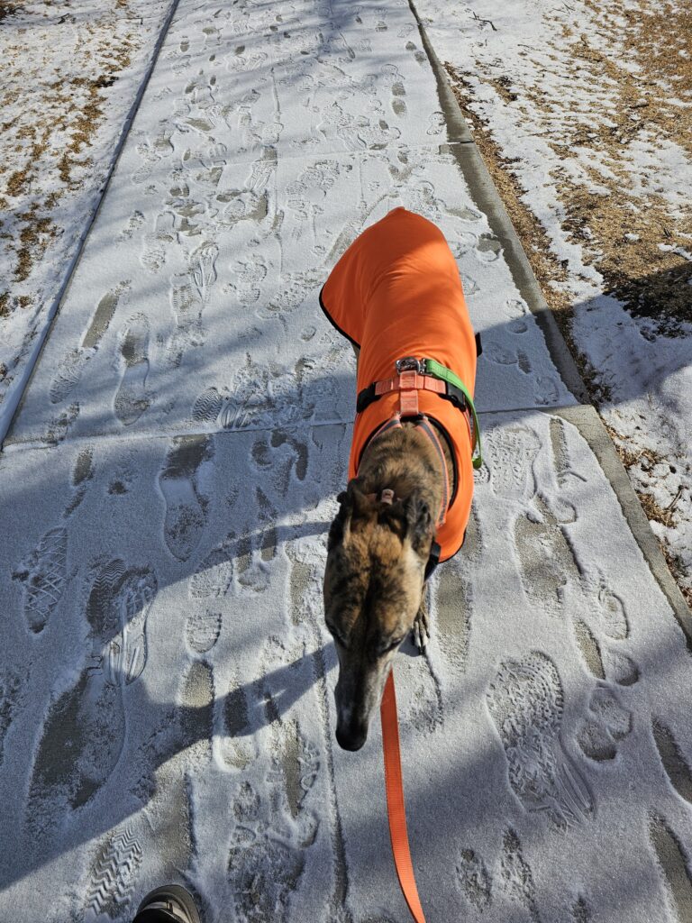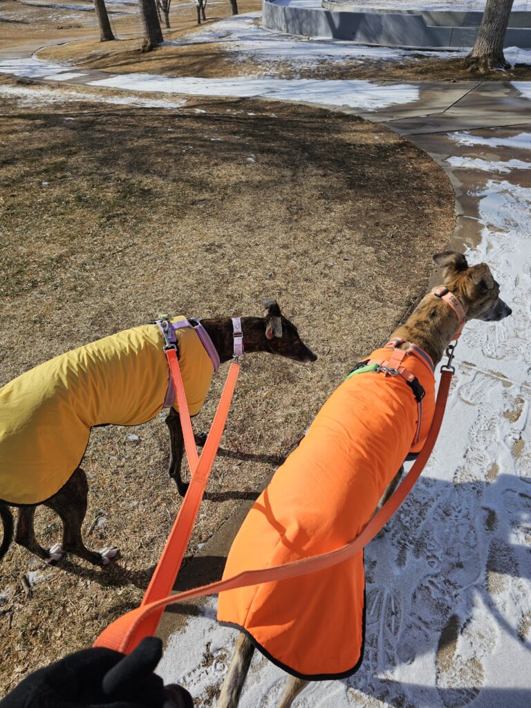 I was finally able to get Res and Climber out for a a walk around the park. They like their walks and when they miss them they become very unhappy. It made it up to about 23 degrees so with coats and extra care we got them out.