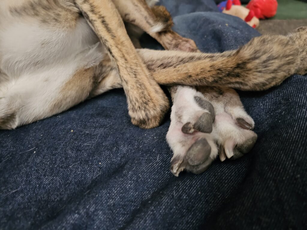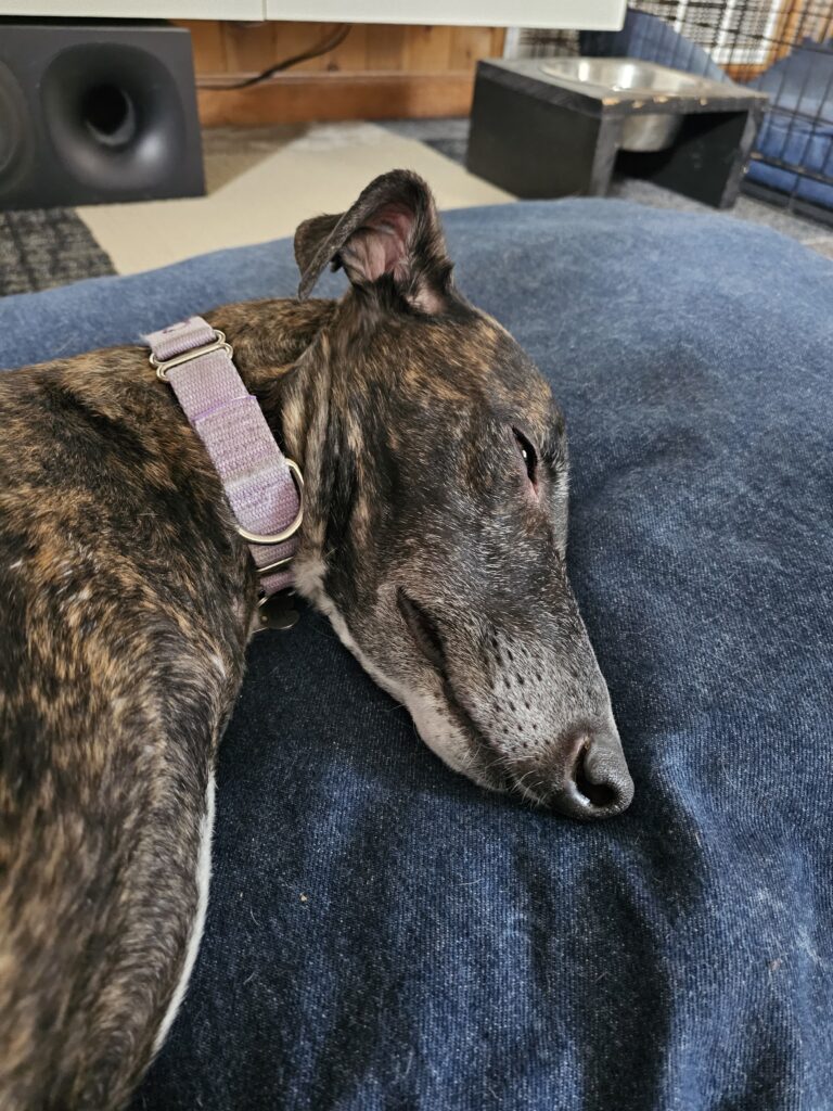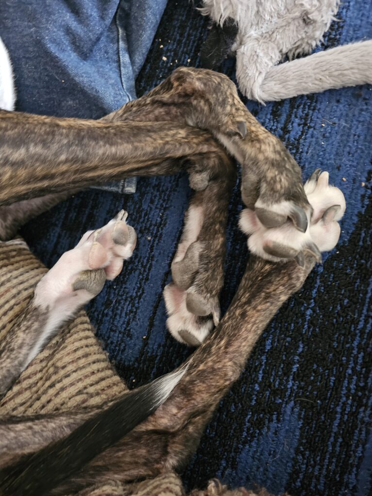 And after their walk it was nap time while Jesse went and explored CostCo. He’s brave, it was a Saturday afternoon before the Patriots loose to the Broncos 🙂 I do not understand how greyhounds ever get themselves untangled enough to get up from a nap fast. I would be falling all over the place.
