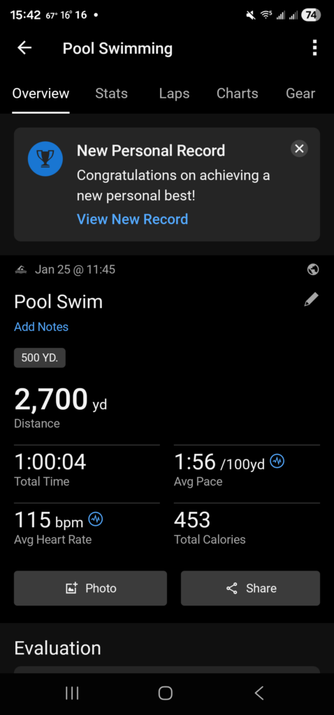 Today was the day to take down Christmas and pack it away for next year. Jesse normally does the tree and it’s best if I stay out of the way, so after I brought the boxes up to the living room I went for an hour swim. I really wanted to get the full hour in because I needed to submit an hour swim to US Master’s Swimming for the first virtual competition event of 2026. I also needed a competitive event to submit to to WellRight to get credit for 1 out of 4 athletic events (it’s a work fitness/health/mental health sponsored thing).