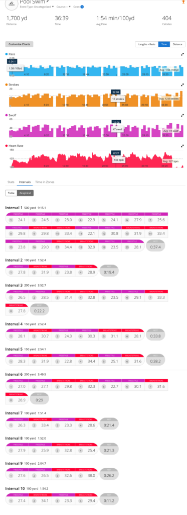 I did make it to the pool today, later than I wanted to, but I did get a 30 minute swim in, did a mile. I am working on my distance, not overall, but distance I can swim at one time without stopping. That is extremely important from an endurance swim perspective. I am somewhat happy with my progress but it is not where I want it yet. I have been hitting 9:15 for 500 yards, which is OK, but I struggle to get past 500 yards, and I really need to be able to do 10 times that comfortably.