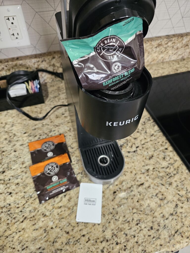 I woke up around 5:30am Central Time, which is an inhumane 4:30am Mountain Time and just could not fall asleep. So, I made myself a cup of coffee, oops, which was a challenge because my hotel room has a Kureg machine and all the coffee packets in the room are not Kureg. Go Hilton! You just keep making it harder and harder to maintain brand loyalty.