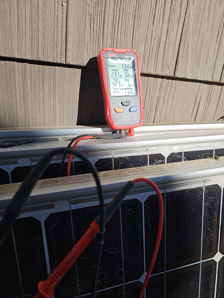After I got them home I worked for another hour and then had to leave to go do a solar inspection. The homeowner had a fire and it was near the solar panels and of course they were all on the ground having been taken off the roof. This means testing each panel by itself. I found most of them were out of spec. And, as usual my ladder was not quite long enough to get on the roof totally. I don’t share much from work anymore, but solar testing is sort of interesting, and a lot of fun for me. I like working with the renewable energy stuff, and I like it more when I can help someone with an honest claim.