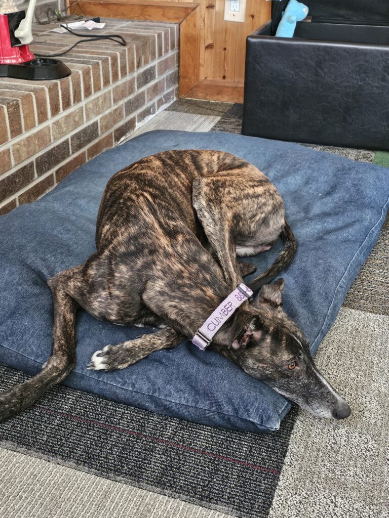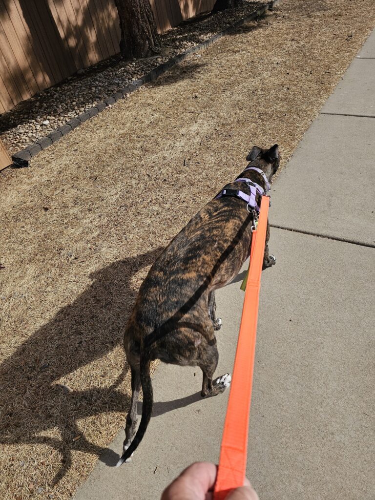 We decided that at the afternoon walk time that Jesse would take Res and I would stay home with Climber. She slept through the walk, and was ready for dinner. I did have to lift her food bowl up a bit for dinner because she was having issues stretching her neck that far down. It’s almost like she ran into something, but neither of us saw what she ran into. This is going to be a “crate rest and leash walk” type of injury.