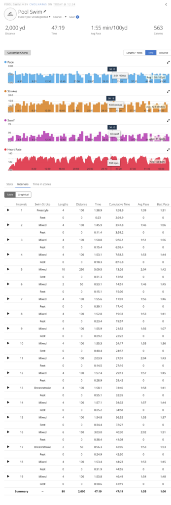 Jesse and I had breakfast (well, brunch) and I finally had a chance to get to the Central Recreation Center for a swim. I had really wanted to get a 3K yard swim in, but the pool was very crowded and I had to share lanes with other swimmers, and that always causes problems since I swim breaststroke and that is a very wide stroke compared with freestyle. At least I didn’t kick anyone. I did get 2K yards in, I am happy with my workout overall.
