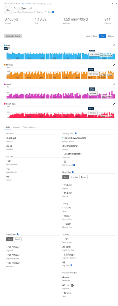 I spent longer in the pool than normal because I am trying to increase my distance. I was able to get 3400 yards in, and took care of a whole bunch of the Garmin and Swim.com challenges for the month of March, on the first day of March. Sort of neat. I am really going to work hard on the swim.com ones for the rest of the month.