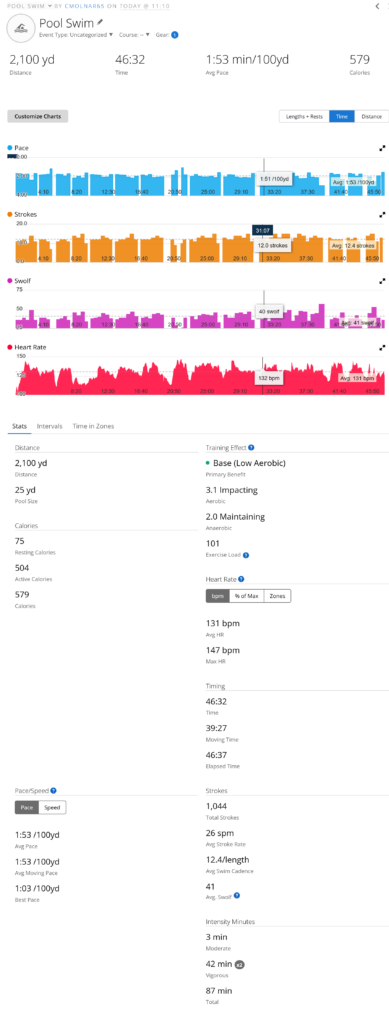I have to work on speed a bit. It is really sad that some of my breaststroke lengths have almost the same times as freestyle. That is a hard one for me to see since freestyle is supposed to be a faster stroke. I do need to make sure I can do a full 2 miles in freestyle, so that is something I am going to work on. But, I was happy with it overall. I think I will probably do the same workout tomorrow.
