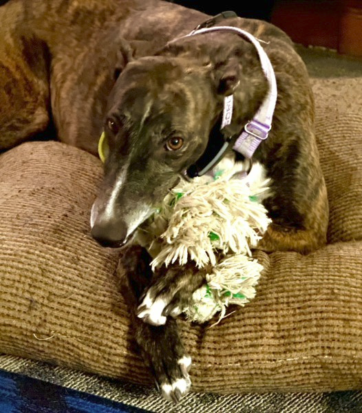 Jesse sent me the cutest photograph of Climber doing what she does most of the time, chewing on a rope toy. I have to stop and buy her another one to take home with me for her. Have to find something for Res as well.