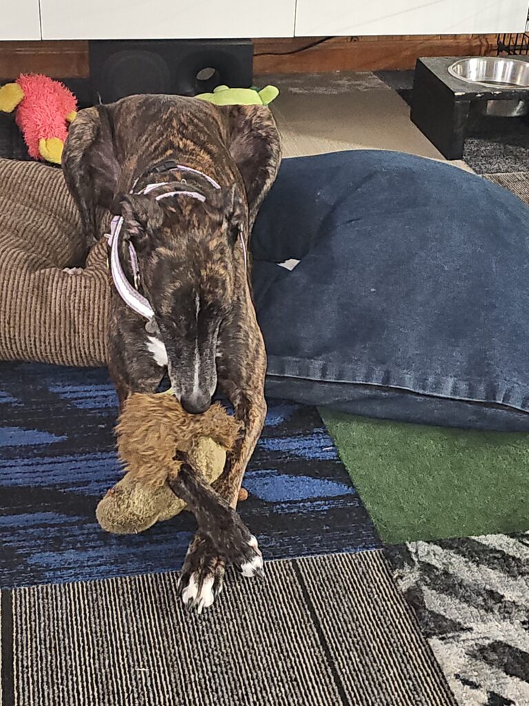 Climber is laying down trying to take the fur off one of their toys, and Res is pretending that he doesn’t want to jump in and help her. Oops. that didn’t last long, they are now both napping.