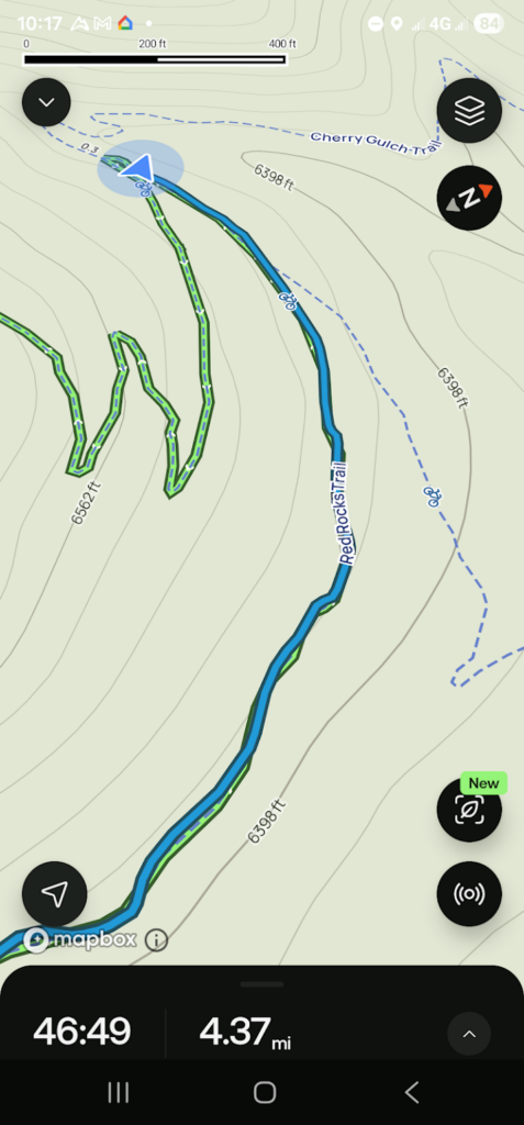 Ignore the distance on the above screenshot. I must have clicked start on the trail before I was even at the parking lot. The app is a little strange, but it is good. Don’t put in your pocket and expect it to provide a good map, it doesn’t. But once you have it out of your pocket and let it get a GPS fix it will re-orientate itself and show you where you are vs where you should be.