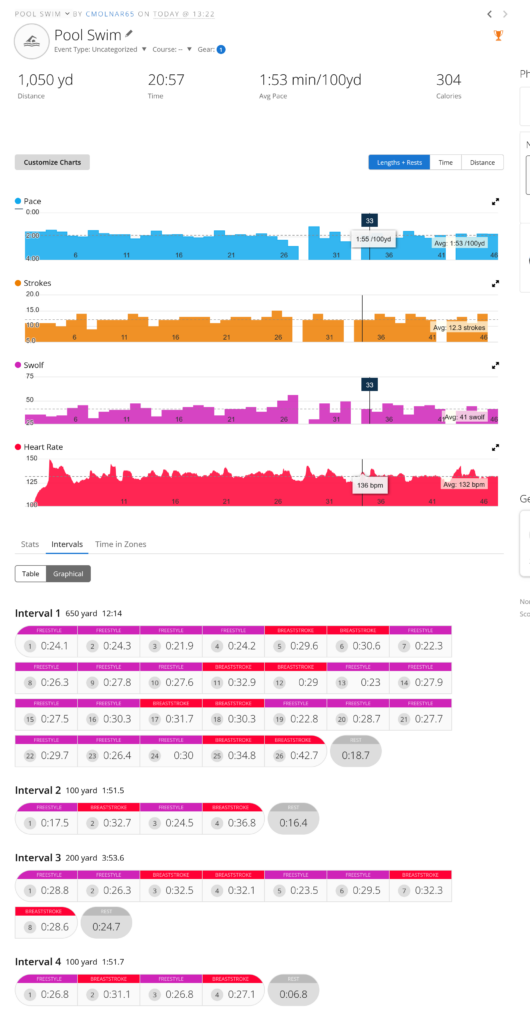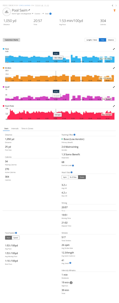 Added another personal record on the 500yard today, still not where I want to be, but getting better. My main goal right now is not speed but rather endurance. I have 11 weeks until the start of the Mountain Swim Series with the Summer Solstice swim, and I need to get myself up to a 2 mile continuous swim. If I can do it in a pool I know that I can do it in open water. Actually, I know I can do it in open water, I have done it before, but doing it again after 3 years of being away from it is the issue. It’s a self confidence issue more than anything else.