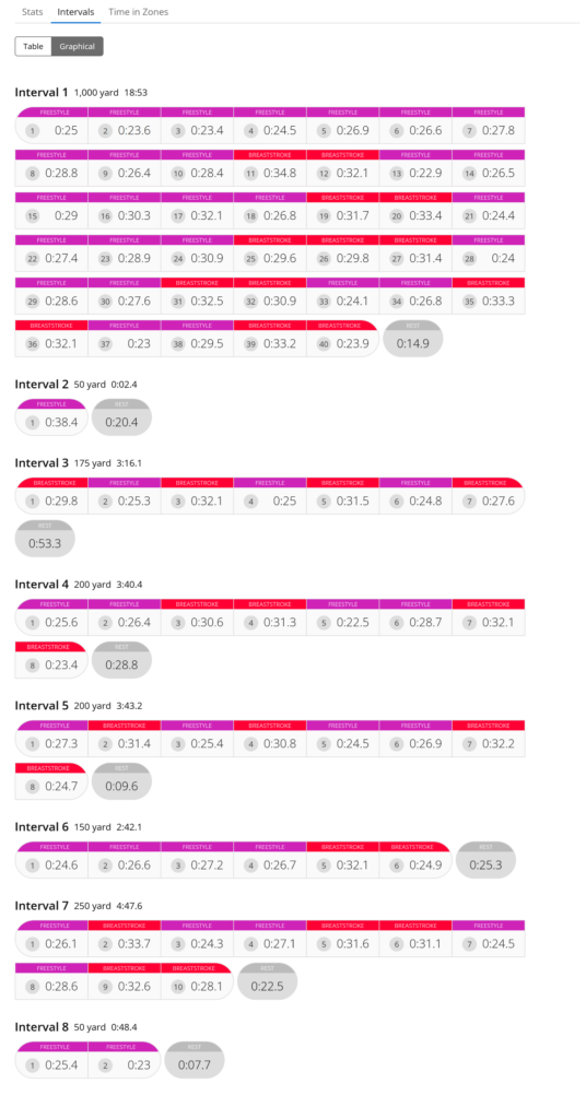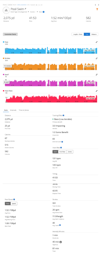 I made it to the pool for lunch and was able to get a lane, had to share at first but then the person I was sharing with snagged another open lane. It was a good workout today. I managed to do 2075 yards according to my watch, but looking at my stats/interval I can see where it missed a length and this should probably have been 2100 yards. Regardless, I accomplished what I wanted to do as my average workout should be a minimum of 2000 yards. By the end of April I am trying to go to 3000 yards per workout. Slow progress is a good thing.