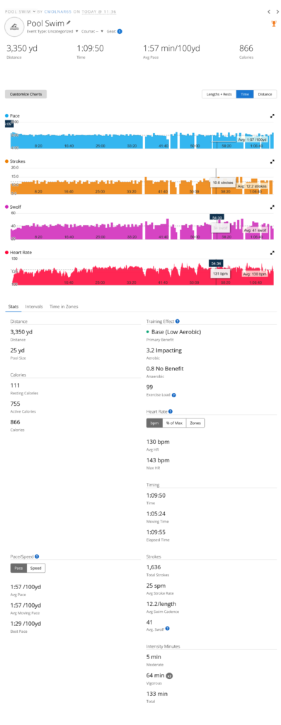 I did take my lunch/swimming break today around 11:15 or so and went down to the Rec Center. I had one of the best swims I have had in a long time. First. I was able to complete an 1800 yard freestyle (crawl) swim. I haven’t done that in over 3 years. Second, I was able to break my personal record an the 1650 yard portion of that. And finally I crossed another Swim.Com challenge for April off the ‘To Complete” list. I did my 3,000 yard swim today. So yesterday I completed the 1,000 and the 2,000 yards. Today I also completed the 1 hour challenge on Swim.Com and also wrapped up April Swim Month on Garmin. That makes me happy. I have April Swim Week left to do on Garmin, but that doesn’t start until next week and is much shorted than what I have already done. For Swim.Com my next major stepping stone and goal is the 5K swim.