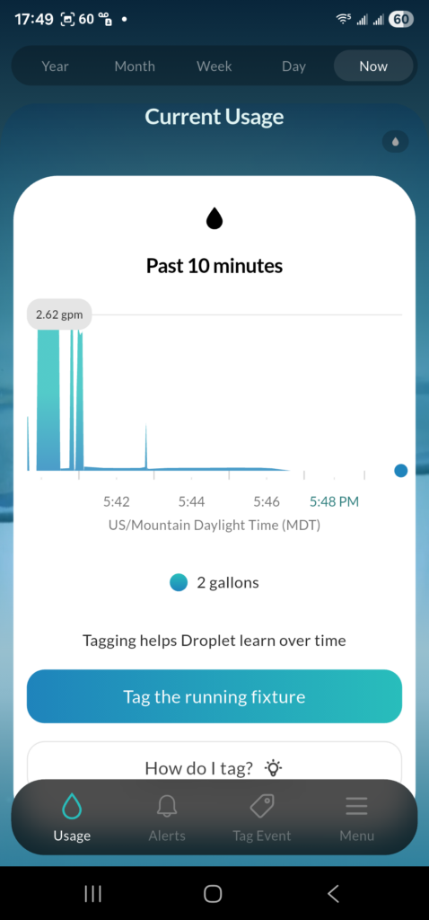 Onto other news, we ordered the Droplet Water monitor from Hydrific Water and it showed up today. It clamps on the main water pipe coming into the home, after the meter, but before any splits and you train it to recognize what fixtures are being used and what fixtures are not being by identifying what is running over a few days when it is showing water flow.