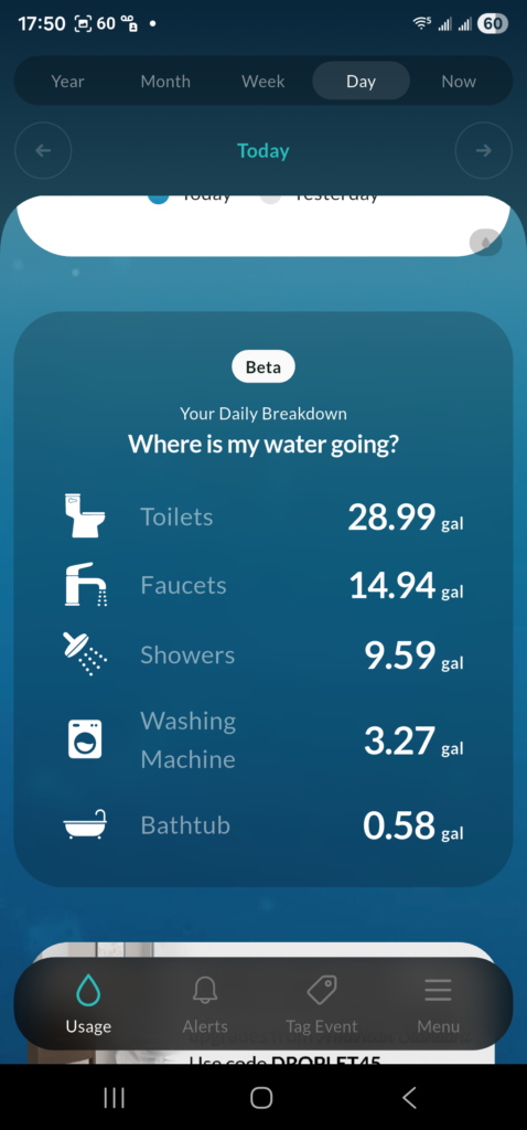 I think it is a little confused on it’s first day and hopefully it will get much better at this. It is currently showing that we used 9.58 gallons today with a shower at 5:45PM this evening. There is just one problem, nobody has showered today yet, that happens in the evening, and more recently I am showering at the Recreation Center after my swim. I think it may have gotten the washing machine right, and I think some of the other appliances, but the shower???? Not really. Maybe that will fix itself in a few days.