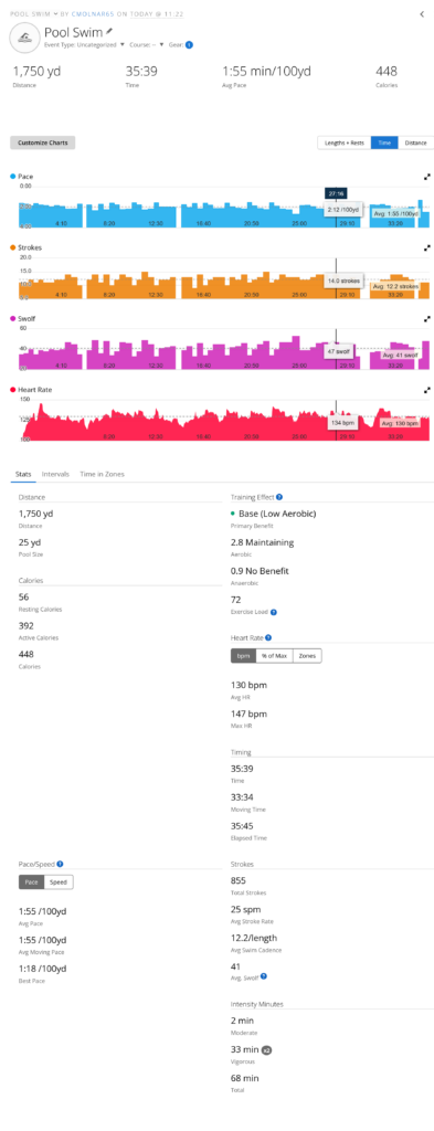 I only did 1750 today, but I do have problems with other people in my lane, would not be bad if the lanes were not so narrow, but me being 6’3″ and I have a very wide breaststroke kick. I need to work on that, but that is the last of my worries. I need to increase distance.