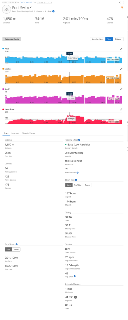 After a good breakfast/lunch/brunch I went over the to pool for an hour. I was planning on a 1 hour swim but was forced to take a 15 minute “safety break”. That is such bullshit, and it makes it impossible to get a good swim in, but I guess that is something I am going to have to keep in mind going forward. I am hoping they realize that the policy normally ignores those swimming laps. I am having a lot of problems preparing for my Mountain Swim if I can’t get an hour in the pool.