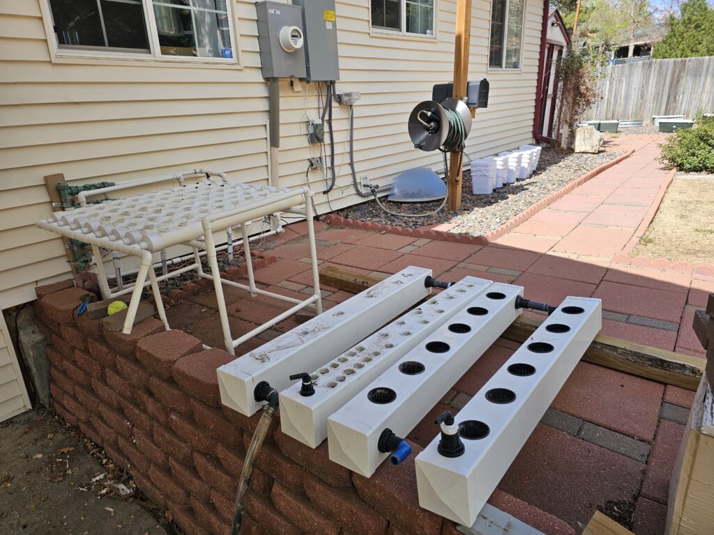 The buckets still need to be put up off the ground. I am going to use a 2×6 on cinder blocks for this. I have the 2×6 and all I need is the cinder blocks. Once that is done I have to run my return line across the bottom back to the patio, the resevior will sit on the patio itself at the base of the retaining wall so we have natural drainage. I am going to use PVC from the buckets, I will also be using a horizontal PVC pipe across the bottom of the rails at the edge of the ledge. We didn’t have good luck with the hoses last year and I think I want to make a change in that regard. I also think I am going to be putting some valves into the drain lines from everything so I can better control the level of the water around the roots.