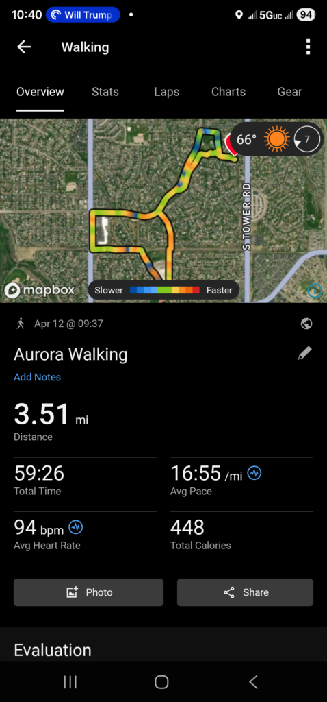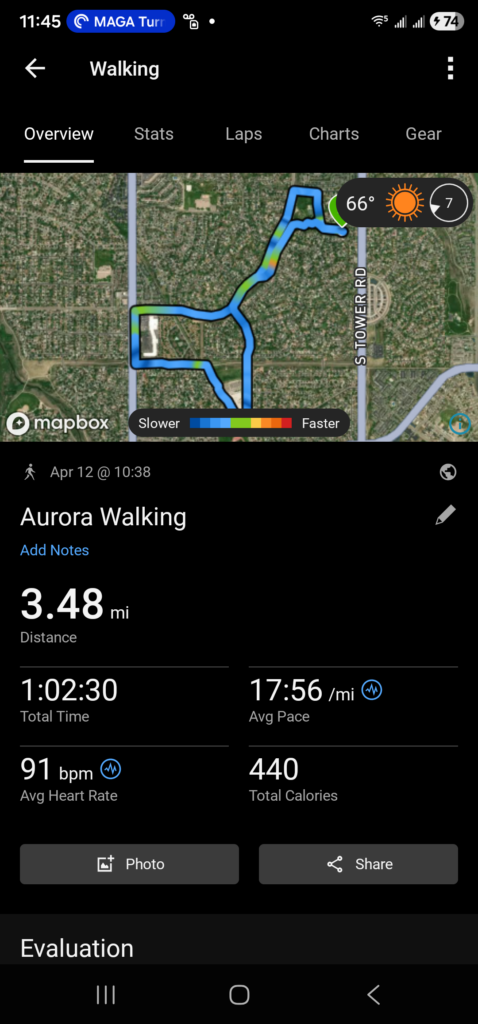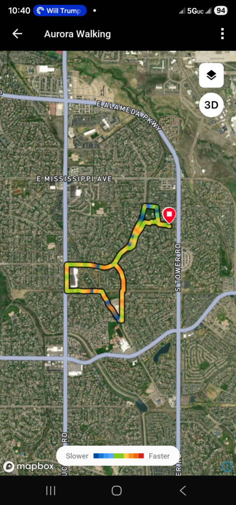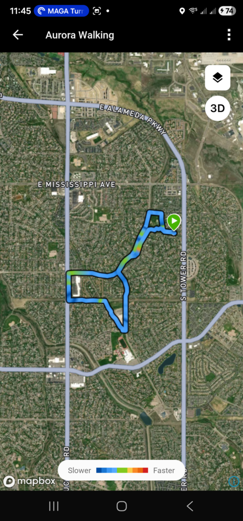Next is Climber’s walk. She did much better than yesterday in terms of pulling on my shoulder. She was actually pretty good. She did 3.48 miles, slightly less the Res, though I am not sure why. It could have been the walk back to a trash can that I had to do with Res. We did make a stop along the way so that I could submit a report of a water leak along Buckley.